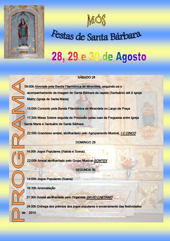 No próximo fim de semana realiza-se a festa de Santa Bárbara de Mós. - Aqui fica o cartaz que nos foi enviado pelos nossos colegas do blogue da Freguesia de Mós (ver: http://fg-mos-vila-antiga-medieval-tmoncorvo.blogspot.com/).